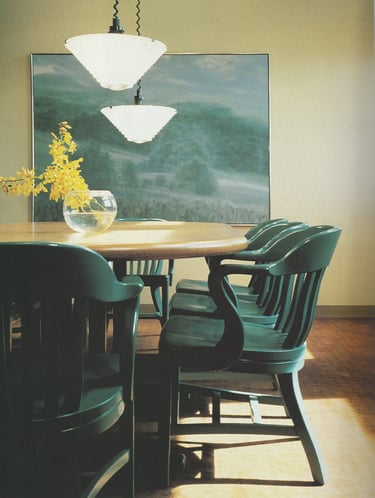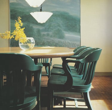 The cool colors of green and blue offer a sense of calm and order in this conference room of the American National Bank