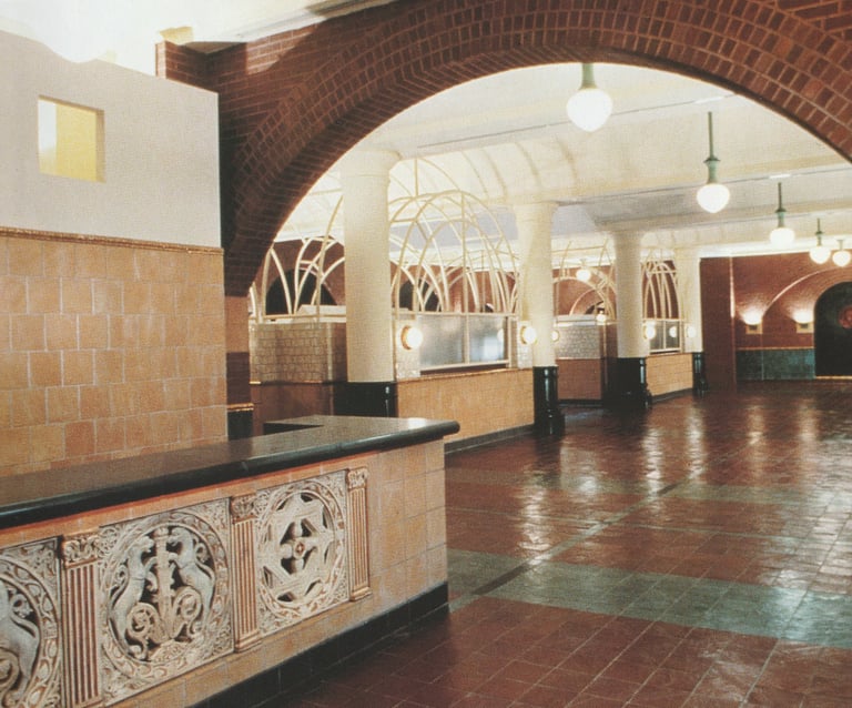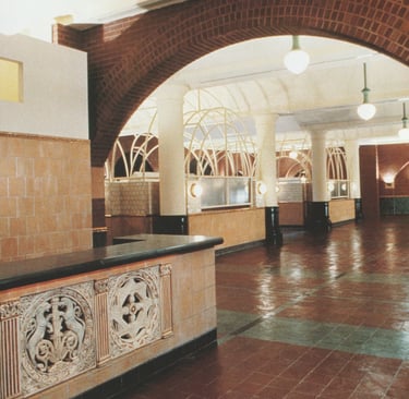 Generally neutral colors dominate the lobby of The Archive, a New York apartment building converted from a federal post office