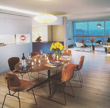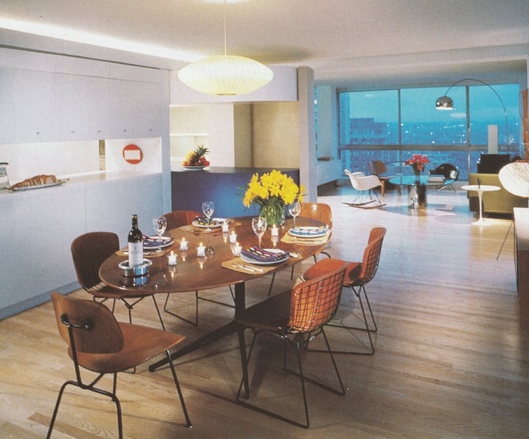 Warm, cool, and neutral tones are all present in the living and dining area of a Chicago apartment