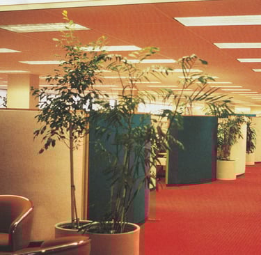A strongly warm color tonality is established by the use of orange carpeting in these offices. The orange tone is also reflected onto the white ceiling