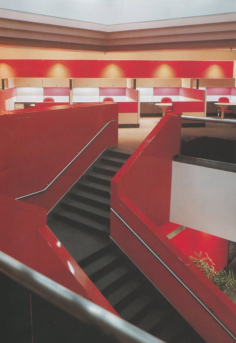 Red and hues close to red dominate the interior of this office complex at the General Motors Saturn plant