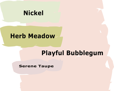 Playful Bubblegum is a delicate tint of pink that works well in a light sunny and living room. The combination of soft and powdered pinks, greens, and mauves is inspired by faded, vintage fabrics and antique, beaded handbags. Fill the room with flea market and thrift store finds, like overstuffed armchairs.