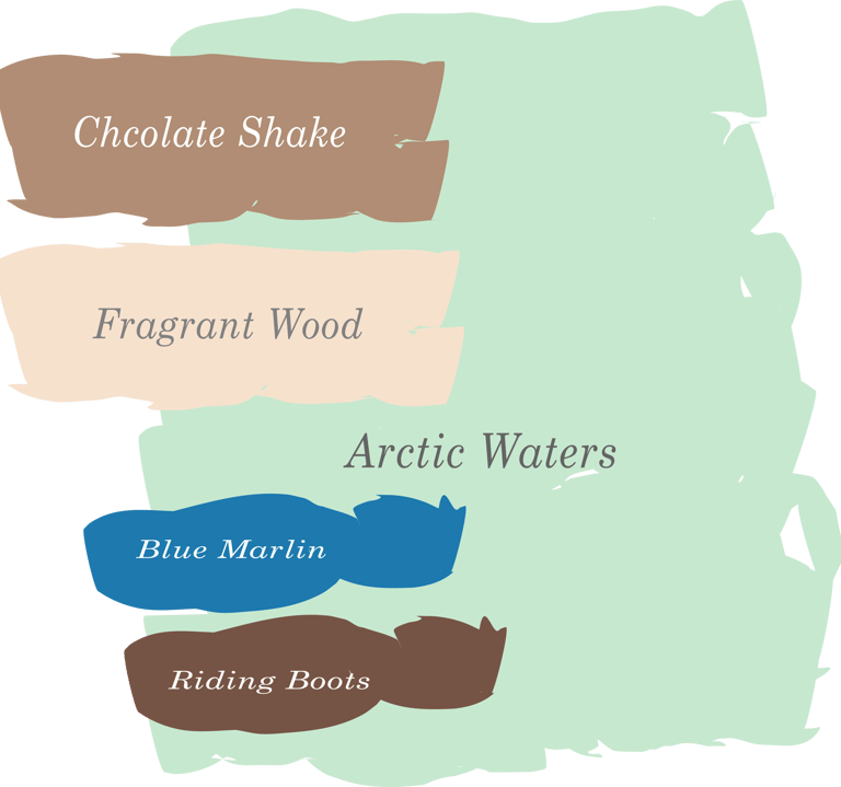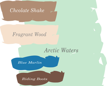 Arctic Waters with Chocolate Shake is an age-old interior combination. This palette is rich and comfortable but with a tantalizing twist. The greens stimulate while the browns sooth and relax the soul. Use these colors in a living room or a dining area for a stunning finish.